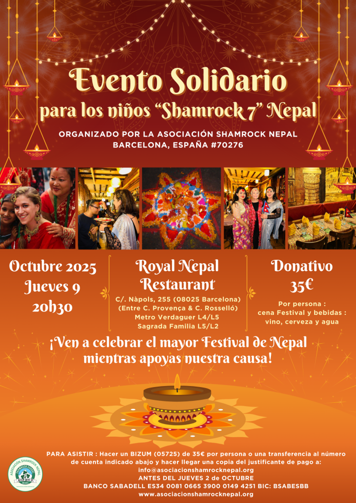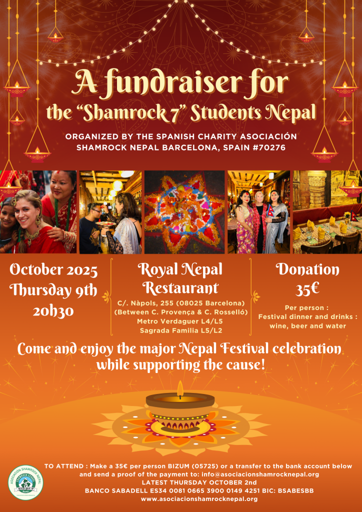 Asociación Shamrock Nepal Barcelona, España. Muchísimas gracias a los amables amigos y seguidores de Shamrock que asistieron a la cena benéfica del festival en el restaurante Royal Nepal de Barcelona el jueves 9 de octubre de 2025 para recaudar fondos para que los siete estudiantes de Shamrock Nepal pudieran continuar sus estudios de secundaria en la escuela Hill Point de Pokhara. También queremos agradecer a los dos bailarines nepalíes que hicieron del evento algo tan especial. 😍 ¡Nos lo pasamos genial! ❤️❤️❤️