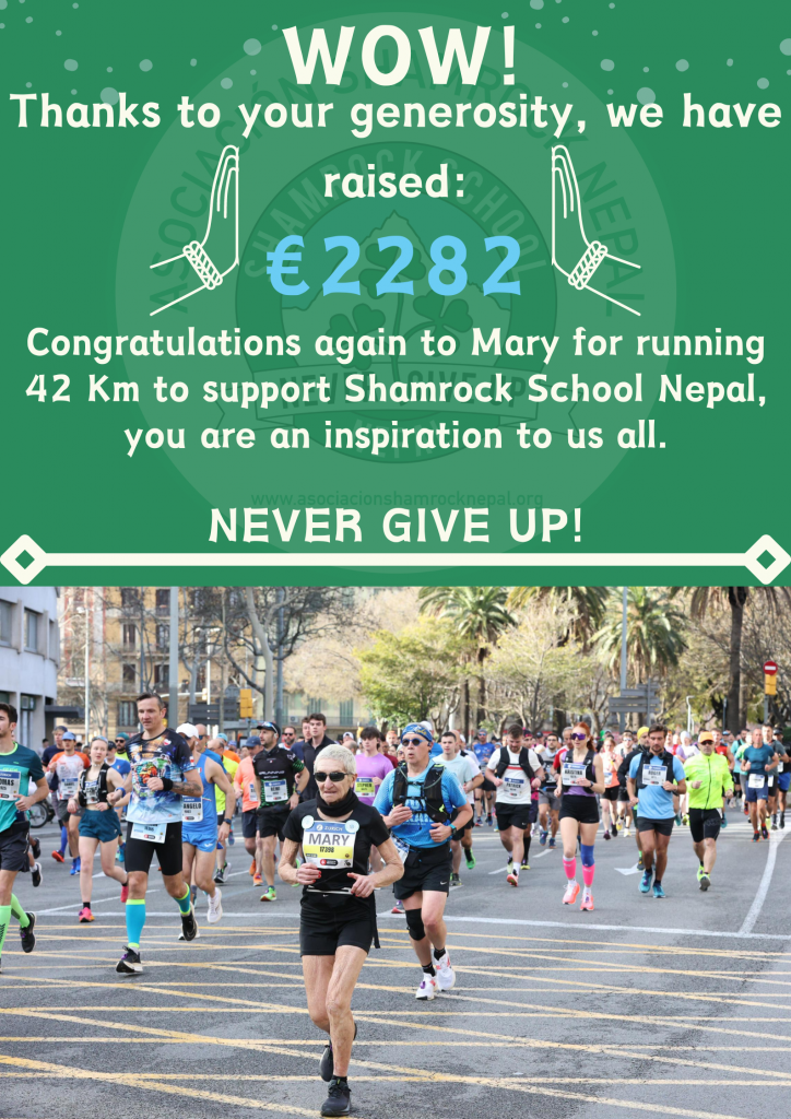 Thank you to all our donors, and especially to Mary. The donations received from Mary’s race for the Zurich Marathon Barcelona 2024 have helped to raise €2282, all to go to Shamrock. All your help goes a long way, and it is appreciated immensely by the students, staff, and team at Shamrock School Nepal.