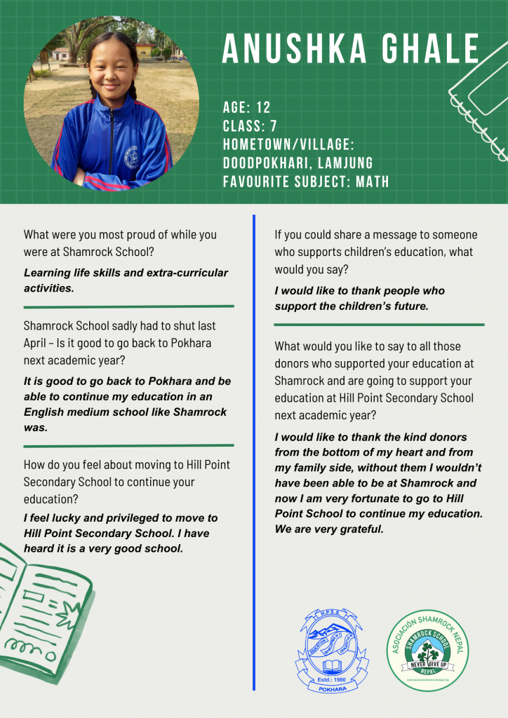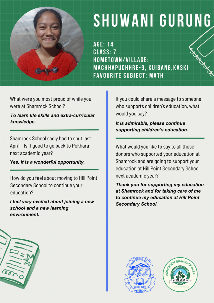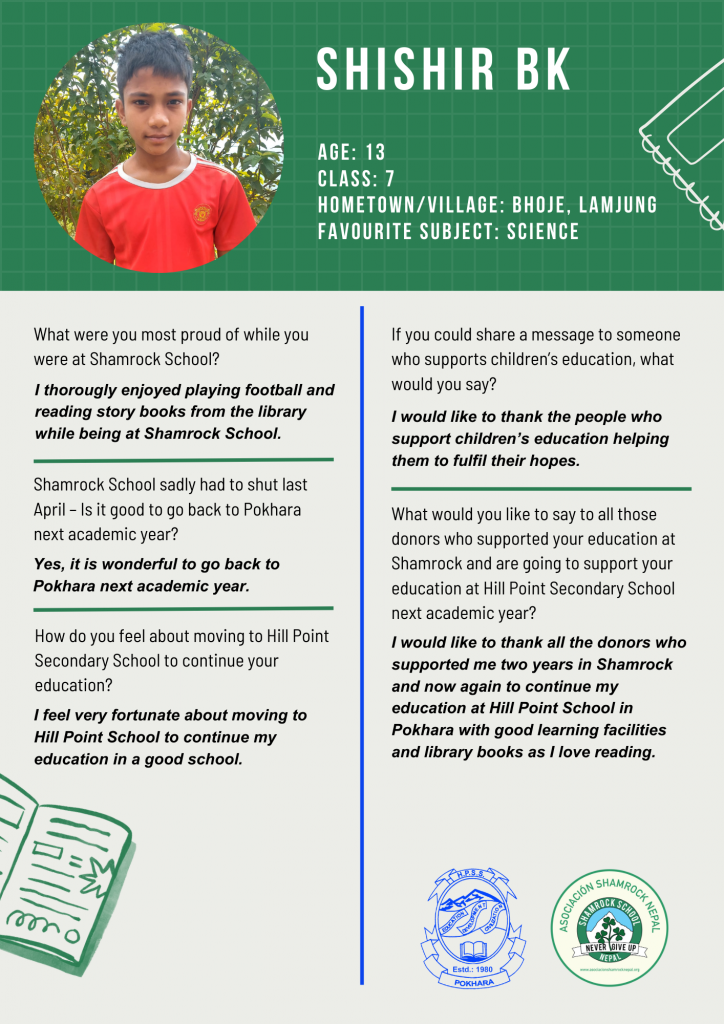 Los 25 estudiantes restantes de la Escuela Shamrock regresaron a sus pueblos de origen para continuar estudiando sin ningún apoyo financiero por parte de las fundaciones que manejaban la Escuela Shamrock por falta de fondos. De esos 25 estudiantes, siete necesitan un apoyo social y financiero extremo. La Asociación Shamrock de Nepal (#70276, Barcelona, España), contando con la ayuda de nuestra comunidad de donantes generosos, decidió apoyar a estos siete estudiantes e inscribirlos en la interna secundaria de Hill Point a partir del año académico 2025-2026, el cual comenzó en abril 2025, para que pudieran terminar la educación secundaria.